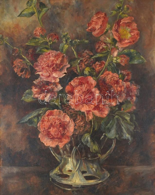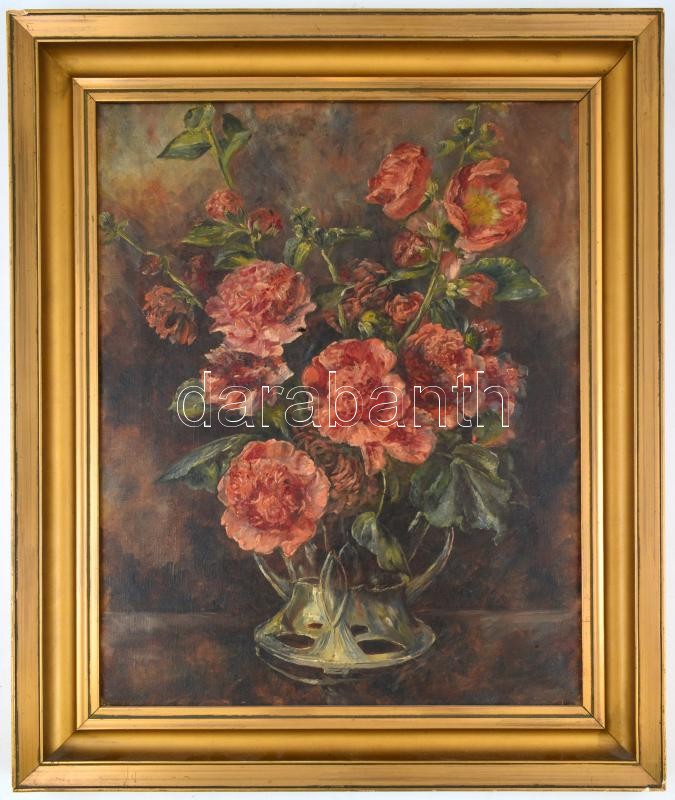 Jelzés nélkül: Virágcsendélet. Olaj, vászon, sérült (lyukas), hátoldalán Szlovák Nemzeti Galéria pecséttel, fa keretben, 59×48,5 cm / Unsigned: Still life with flowers. Oil on canvas, damaged (hole), with the stamp of the Slovakian National Gallery on the back, framed, 59×48,5 cm