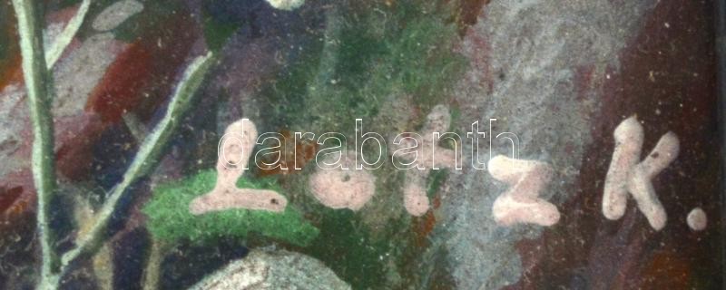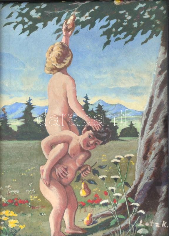 Beschreibung: Lotz jelzéssel: Körteszedés. Gouache, papír. Üvegezett fa keretben, 20,5x15 cm
