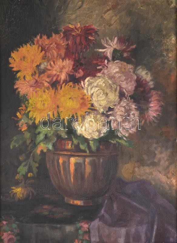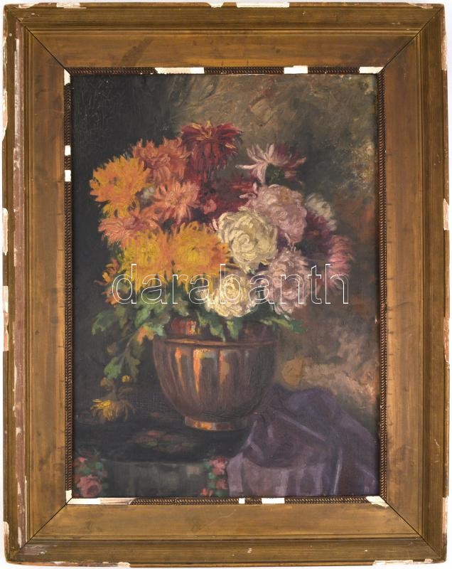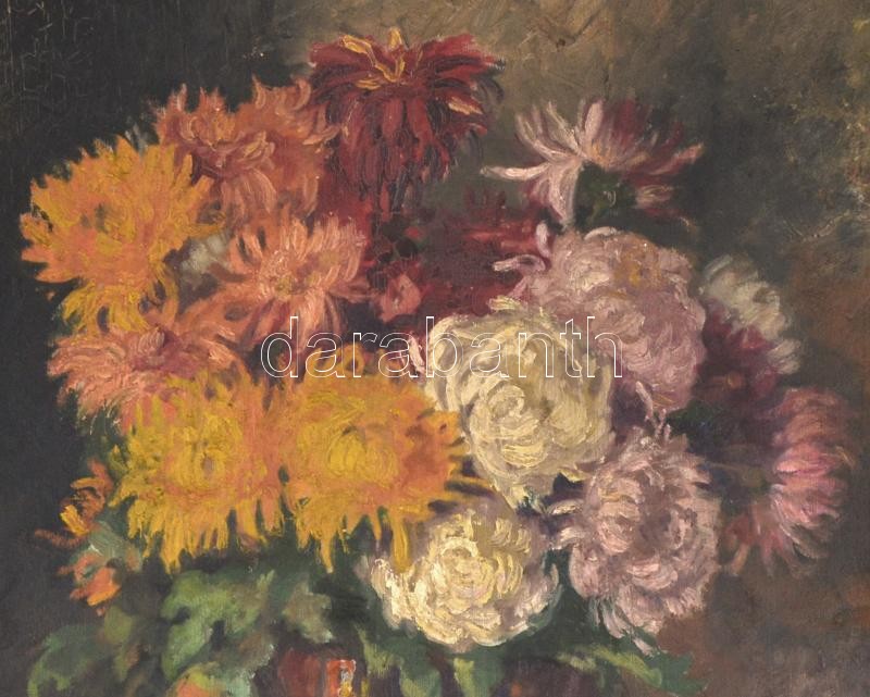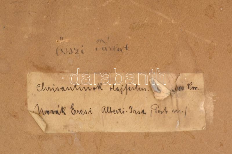 Novák Erzsébet (1893-?): Krizantémok (1920-25 körül). Olaj, karton, jelzett (keret által takarva), sérült fa keretben, 67,5x50 cm. Hátoldalán "Őszi tárlat" felirattal valamint címkén kézzel írt adatokkal: "Chrisantinok, olajfestm., ára 1200 kor., Novák Erzsi, Alberti-Irsa (Albertirsa), Pest m."