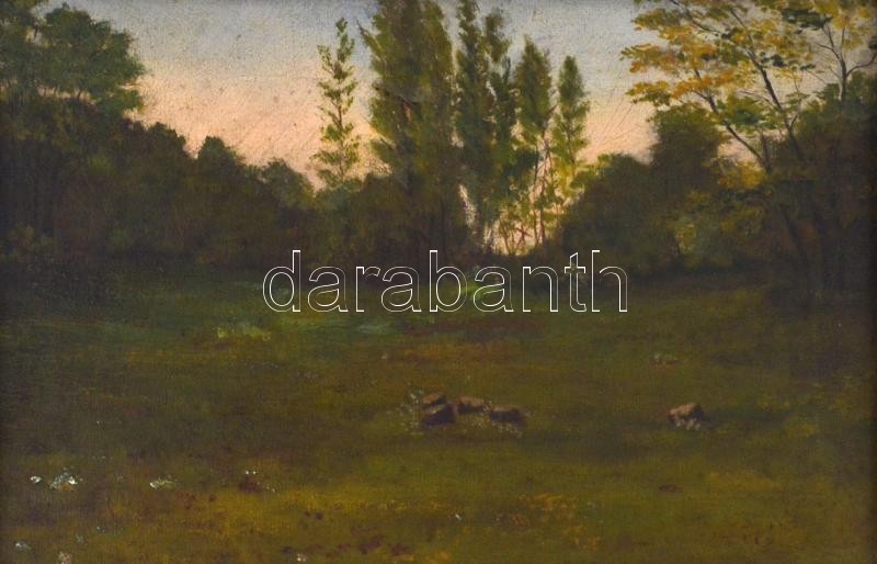 Beschreibung: Olv. jelzéssel: Tisztás. Olaj, vászon, sérült, fa keretben, 20x31 cm