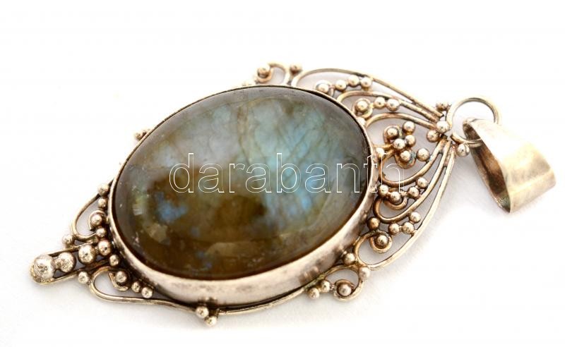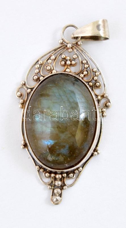 Beschreibung: Ezüst(Ag) filigrán és granulációs technikával készült kaboson formára csiszolt labradorit medál, jelzetlen, h: 4,5 cm, bruttó: 4,5 g
