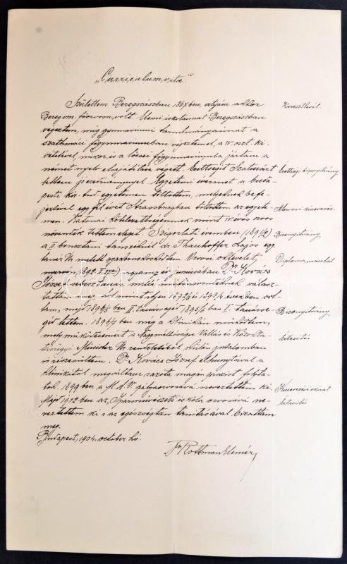 Beschreibung: 1904 Dr. Rottmann Elemér önéletrajza, bélyegzéssel, aláírással, 30 f okmánybélyeggel, hajtás mentén kis szakadással