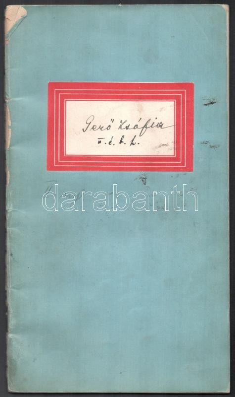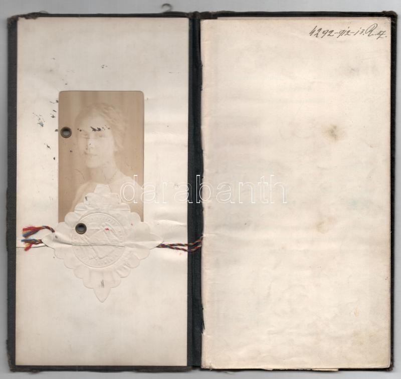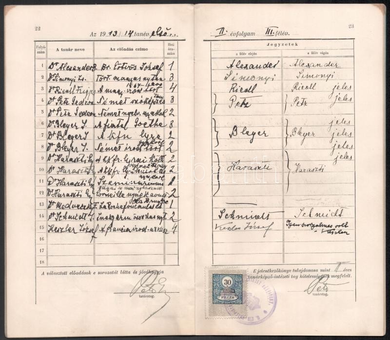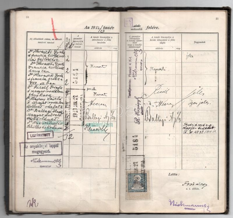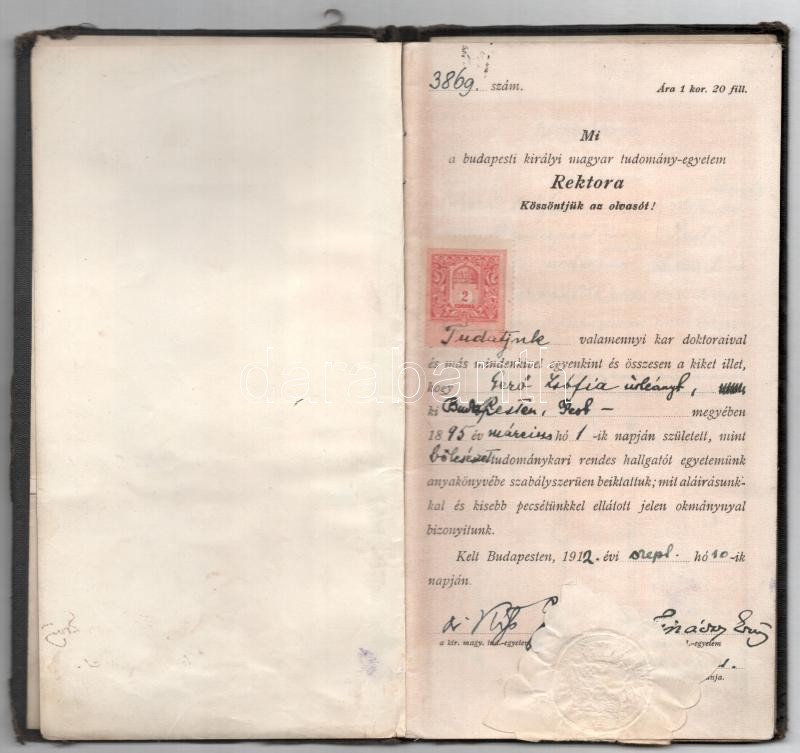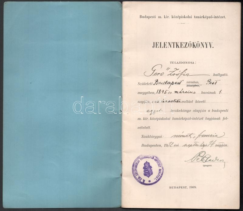 1912-16 A Budapesti Kir. Magyar Tudomány-Egyetem német-francia szakos, izraelita vallású hallgatójának fényképes leckekönyve és jelentkezőkönyve. Többek közt Alexander Bernát, Bleyer Jakab, Riedl Frigyes, Petz Gedeon, Haraszti Gyula és más tanárok aláírásaival.