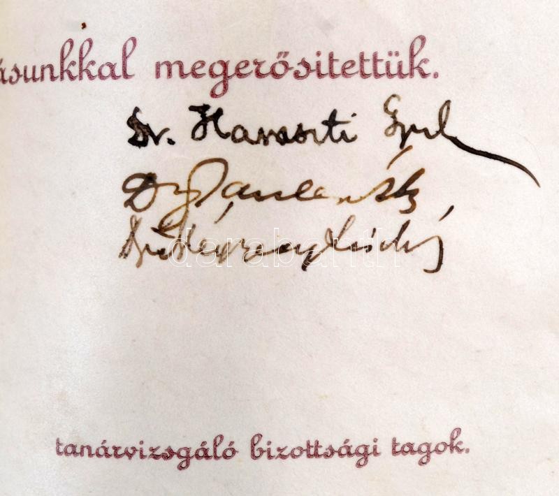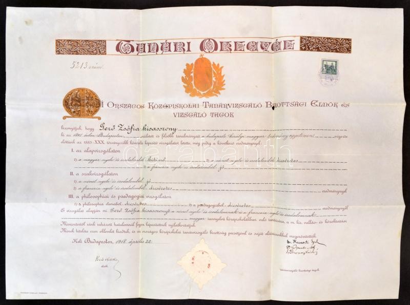 1918 Budapest, díszes tanári oklevél német-francia szakos középiskolai tanárnő részére, többek közt Haraszti Gyula (1858-1921) irodalomtörténész, esztéta, egyetemi tanár aláírásával. Hajtásnyomokkal, kisebb sérüléssel.
