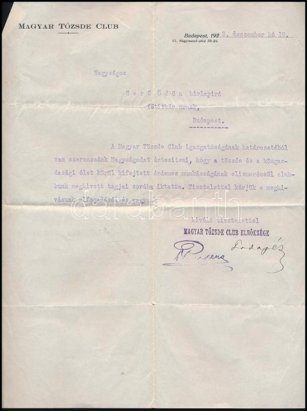 Beschreibung: 1923 A Magyar Tőzsde Klub értesítő levele Gerő Ödön (1863-1939) kritikus, újságíró, író részére melyben meghívott taggá választásáról értesítik