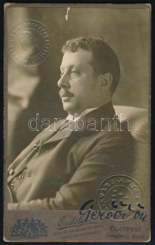 1925 Gerő Ödön (1863-1939) műkritikus, újságíró, a Pester Lloyd munkatársának fényképes személyazonossági igazolójegye (igazolványa, bérlete) a déli vaspálya társaság vonalaira. A fénykép Erdélyi Mór (1866-1934) fotográfus, fotóriporter felvétele. Gerő Ödön által aláírt.
