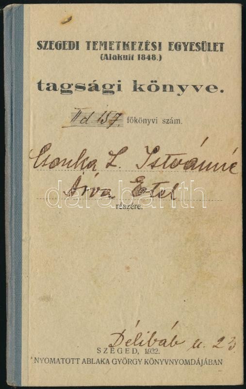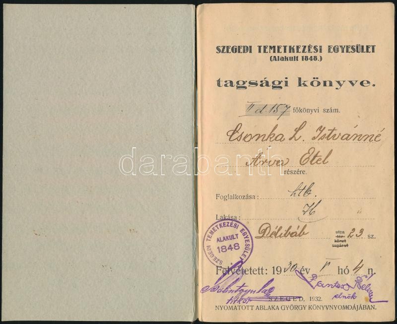 1930 Szegedi Temetkezési Egyesület tagsági könyve, tagdíjbélyegekkel https://www.darabanth.com/de/374-Fernauktion/374.0/Kunst-Dokumente-andere-Sammelgebiete/Dokument~2000106/1930-Szegedi-Temetkezesi-Egyesulet-tagsagi-konyve-tagdijbelyegekkel~II2185607