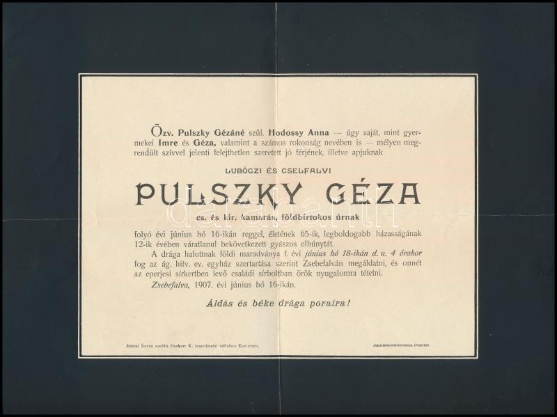 Beschreibung: 1907 Zsebefalva/Župčany, lubóczi és cselfalvi Pulszky Géza cs. és kir. kamarás, földbirtokos gyászjelentése.