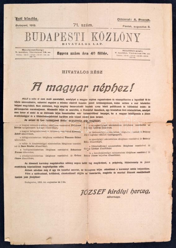 1919 Budapesti Közlöny. 1919. aug. 8., 71. sz. Szerk.: Bársony István. Bp., Légrády, 4 p. Románok által cenzúrázott: "Censurat: A. Precup", szakadásokkal
