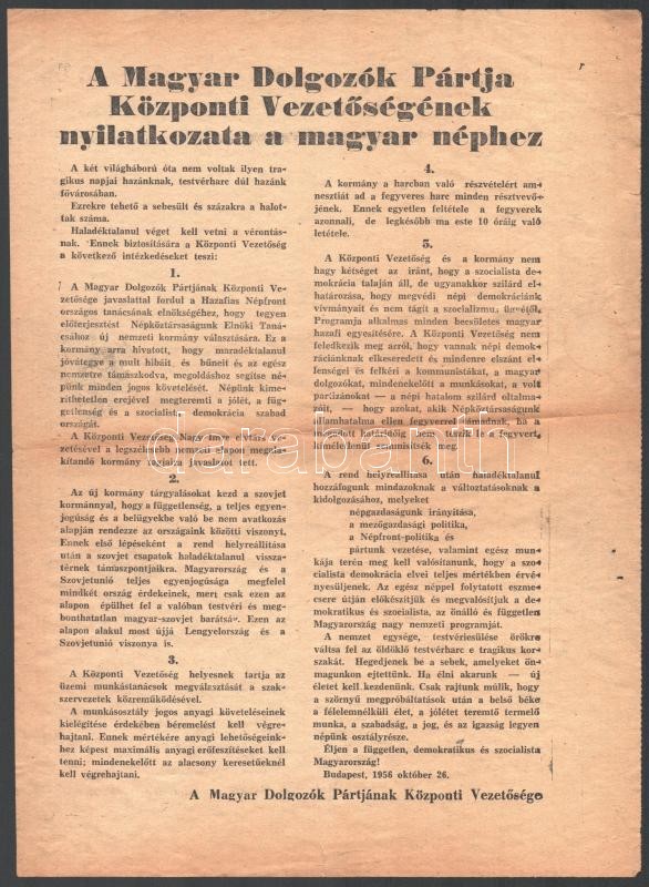 1956 A Magyar Dolgozók Pártja Központi Vezetőségének nyilatkozata a ma... https://www.darabanth.com/de/374-Fernauktion/374.0/Kunst-Dokumente-andere-Sammelgebiete/Drucksachen~30/1956-A-Magyar-Dolgozok-Partja-Kozponti-Vezetosegenek-nyilatkozata-a-magyar-nephez-1956-okt~II2151943