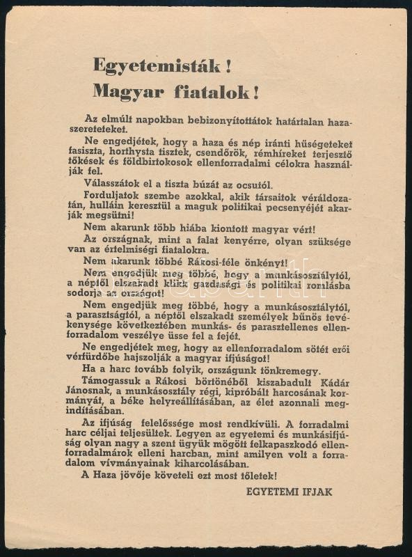 1956 Egyetemisták! Magyar fiatalok! 1956-os röplap https://www.darabanth.com/de/374-Fernauktion/374.0/Kunst-Dokumente-andere-Sammelgebiete/Drucksachen~30/1956-Egyetemistak-Magyar-fiatalok-1956-os-roplap~II2151922