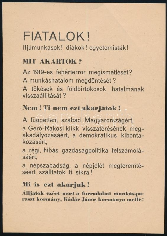 1956 Fiatalok! Ifjúmunkások! Diákok! Egyetemisták! ... Álljatok ezért most a forradalmi munkás-paraszt kormány, Kádár János kormánya mellé!, 1956-os röplap.