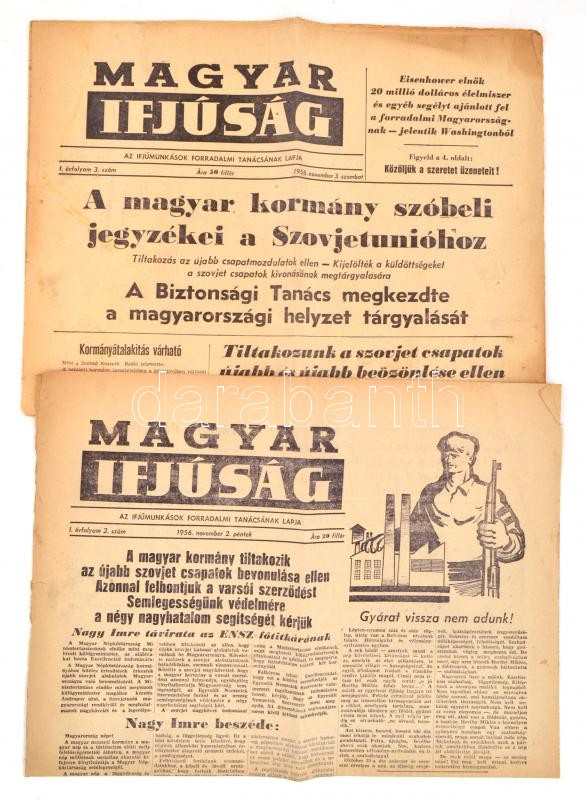 1956 Magyar Ifjúság. Ifjúmunkások Forradalmi Tanácsának lapja, I. évf.... https://www.darabanth.com/de/374-Fernauktion/374.0/Kunst-Dokumente-andere-Sammelgebiete/Drucksachen~30/1956-Magyar-Ifjusag-Ifjumunkasok-Forradalmi-Tanacsanak-lapja-I-evf-2-3-szam-1956-no~II2180415