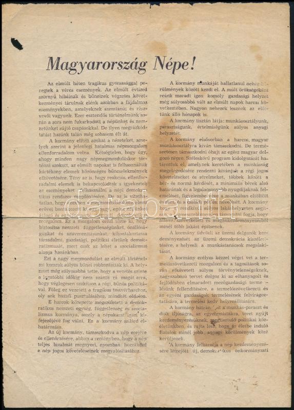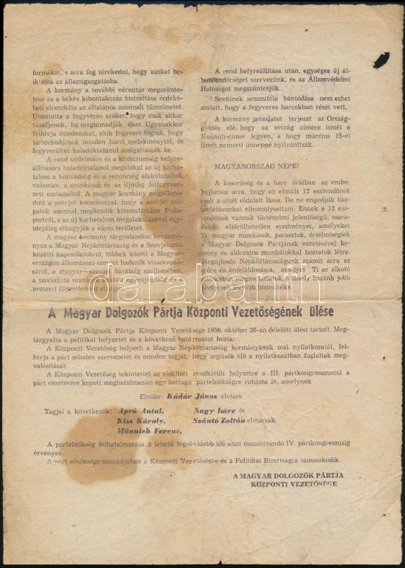 1956 Magyarország népe! Magyar Dolgozók Pártjának központi vezetőségének röplapja, benne az 1956. okt. 28.-án megválasztott vezetőség névsorával (Kádár János, Apró Antal, Kiss Károly, Münnich Ferenc, Nagy Imre, Szántó Zoltán), foltos,a szöveget nem érintő kis lyukkal, hajtásnyommal, 28x20 cm