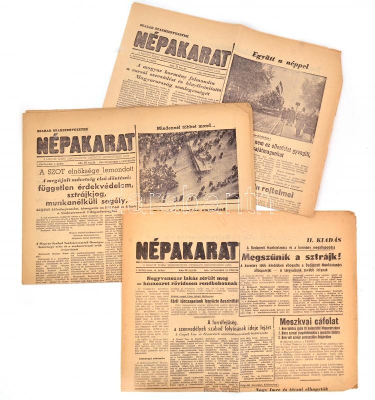 1956 Népakarat. I. évf. 1., 2. és 10 számai. 1956. nov. 1., 2., 23. Magyar Szabad Szakszervezetek Országos Szövetségének lapja. Bp., Athenaeum, 4+4+4 p.