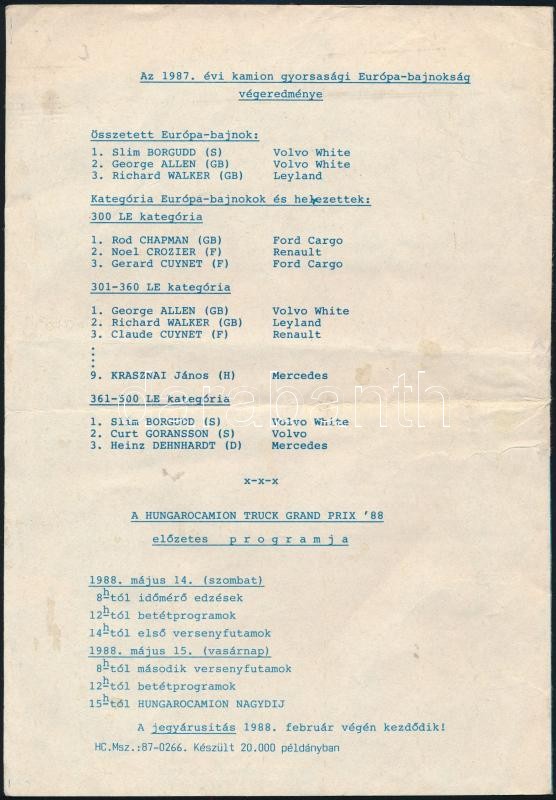 1988 Hungarocamion Truck GP, 1988. május 14-15., Hungarocamion Truck G... https://www.darabanth.com/de/374-Fernauktion/374.0/Kunst-Dokumente-andere-Sammelgebiete/Drucksachen~30/1988-Hungarocamion-Truck-GP-1988-majus-14-15-Hungarocamion-Truck-Grand-Prix-88-programfuzet-~II2191658