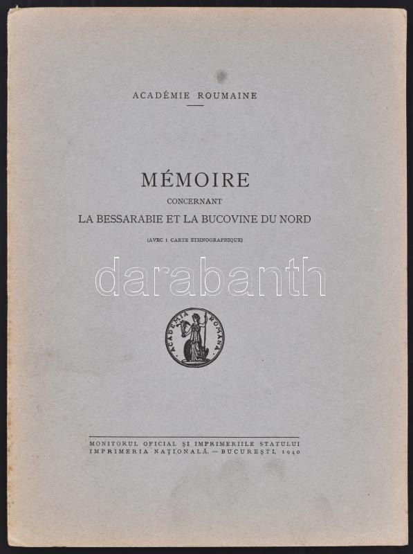 Mémoire cocerant La Bessarabie et La Bucovine du Nord. Bukarest, 1940, Accademia Roumanie. Vitairat Besszarábia és Észak-Bukovina szovjet megszállásáról, Besszarábia és Észak-Bukovina néprajzi térképével. Tűzött papírkötésben