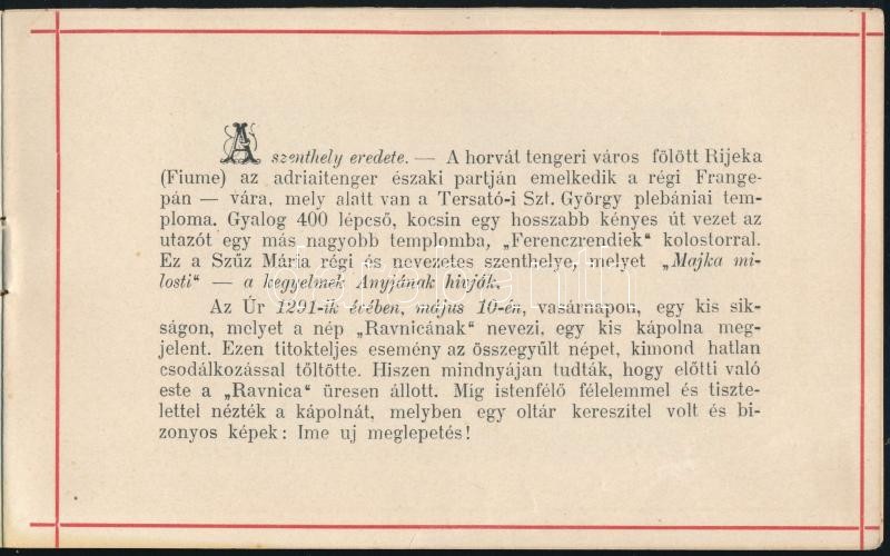 Beschreibung: cca 1890 A Horvátország-tersatói Isten-anyja-szenthelyének emlékkönyve. 16p. Papírborítékban
