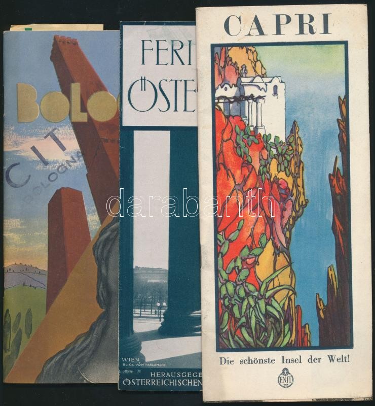 Beschreibung: cca 1930 8 db külföldi utazási reklám nyomtatvány, városbemutató kiadvány (Braunschweig, Helgoland, Ljubljana, Jugoslavija, Bologna, Capri stb.) / 8 tourist guides