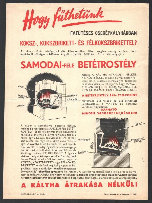 Beschreibung: cca 1940 Hogy fűthetünk fafűtéses cserépkályhákban koksz-, koszbrikett- és félkokszbrikettel? Samodai-féle betétrostély prospektus. Bp., Forrás-ny., 1 sztl. lev.