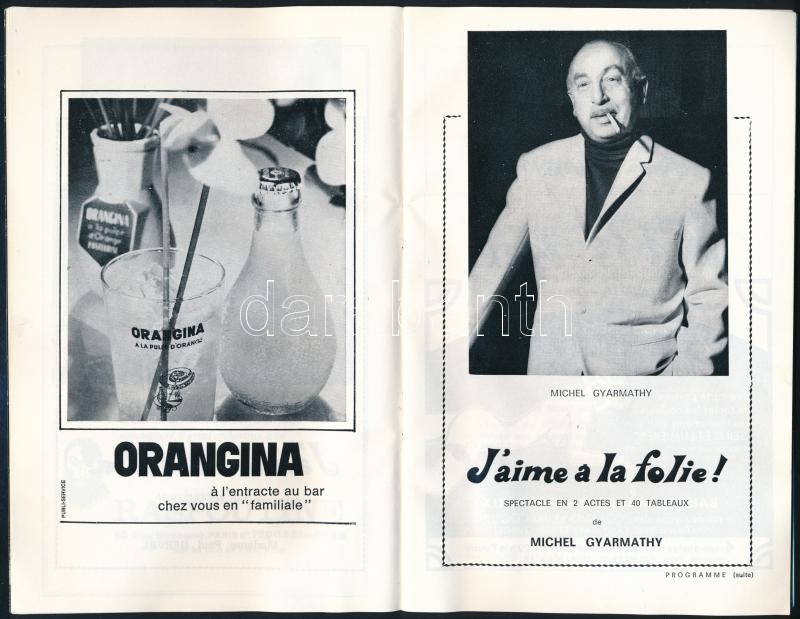 cca 1971 Folies Bergére programfüzete, benne Michel Gyarmathy (1908-1996) a Folies Bergére magyar származású művészeti igazgatójának, rendezőjének, jelmez- és díszlettervezőjének fotójával, francia nyelven, korabeli reklámokkal.