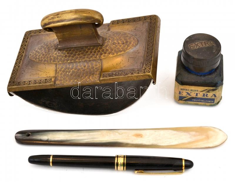 Beschreibung: Régi bronz tapper, 13×7,5×10 cm + szaru levélbontó + töltőtoll tintásüveg + töltőtoll, összesen: 4 db, kis kopásnyomokkal