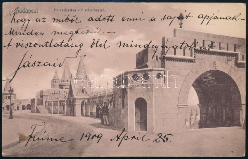 1909. április 25. Jászai Mari (1850-1926) színésznő autográf, aláírt képeslapja Gerő Ödönné Hermann Leontinnak, Gerő Ödön (1863-1939) művészeti újságíró, szerkesztő feleségének. A képeslap a Halászbástyát ábrázolja, de Jászai Fiumei utazásáról ír: "Édes Leonkám! Itt is van ám Gyapju utcai szinház a mi számunkra - magyaroknak, tudod. Micsoda piszok kulipintyó! (...)", írja a színésznő. Kis szakadással.