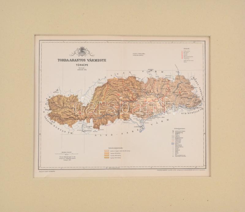 1897 Torda-Aranyos vármegye térképe, terv. Gönczy Pál, Pallas Nagy Lexikona, 1:540000, Bp., Posner Károly Lajos és fia, paszpartuban, hajtásnyommal, kisebb szakadásokkal a lap szélén, 22,5×28 cm / 1897, map of county Comitatul Turda-Aries, in passepartout, with small tears on the edge