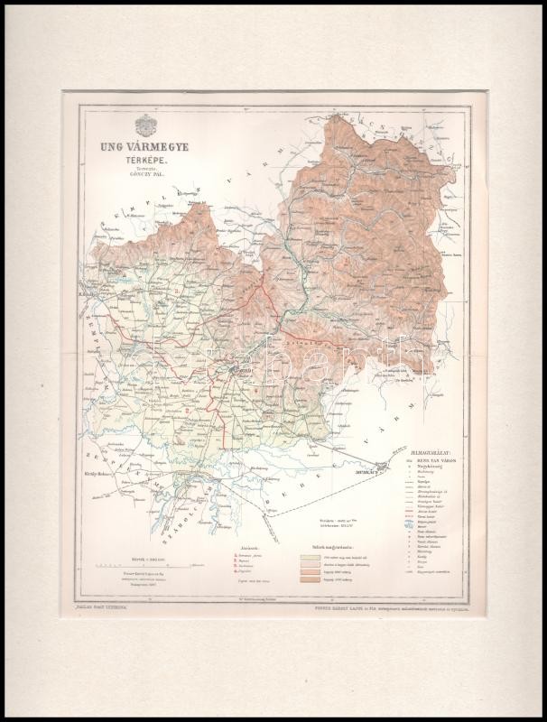 1897 Ung vármegye térképe, terv. Gönczy Pál, 1:380.000, Pallas Nagy Lexikona, Bp., Posner Károly Lajos és Fia, paszpartuban, 28×22,5 cm / 1897 Map of Ung county (Užský komitát/ Užská župa / Užská stolica), now part of Ukraine, Slovakia and Hungary, in passepartout