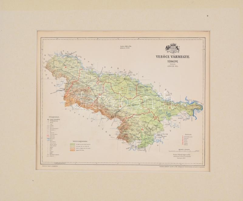 1897 Verőce vármegye térképe, terv. Gönczy Pál, Pallas Nagy Lexikona, 1:570000, Bp., Posner Károly Lajos és fia, paszpartuban, 22,5×28 cm / 1897, map of Virovitica county (Virovitička županija), now Croatia, in passepartout