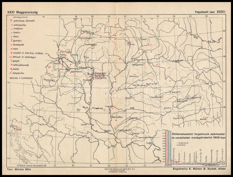 Beschreibung: Magyarországi vegyészeti ipara, térkép, a Kogutowicz-Márton: "Kereskedelmi atlasz" térképe, hajtott, 16,5×21,5 cm