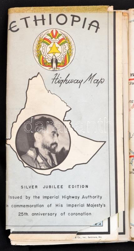 cca 1950-1960 Etiópia úthálózati térképe, 1:2.000.000, hátulján információkkal, az uralkodó koronázásának 25. évfordulójára kiadva, Baltimore, A. Hoen & Co., szakadt, ragasztott állapotban, 90x91 cm