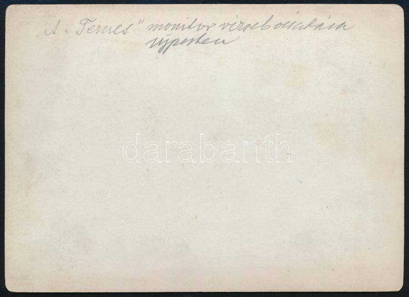 1904 Az SMS Temes, az Osztrák-Magyar Monarchia Haditengerészetének monitorhajójának vízre bocsátása Újpesten, Dunai Flottila, keményhátú fotó, hátulján feliratozott, 10x15 cm / SMS Temes, Austro-Hungarian Navy monitor ship, setting afloat at Újpest, Danube Fleet, photo, labelled on the back