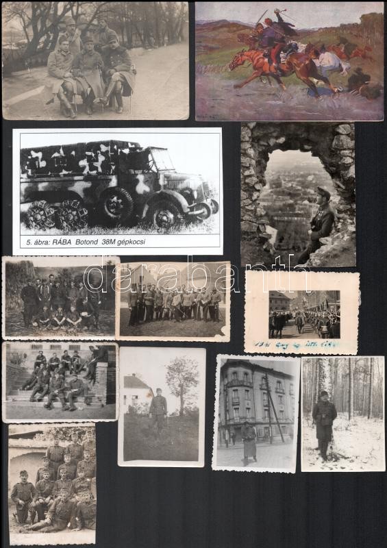 Beschreibung: cca 1930-1940 12 db fotó, fotólap, levelezőlap és nyomtatott fotó katonai témában, 6x8,5 és 9,5x15,5 cm közötti méretekben