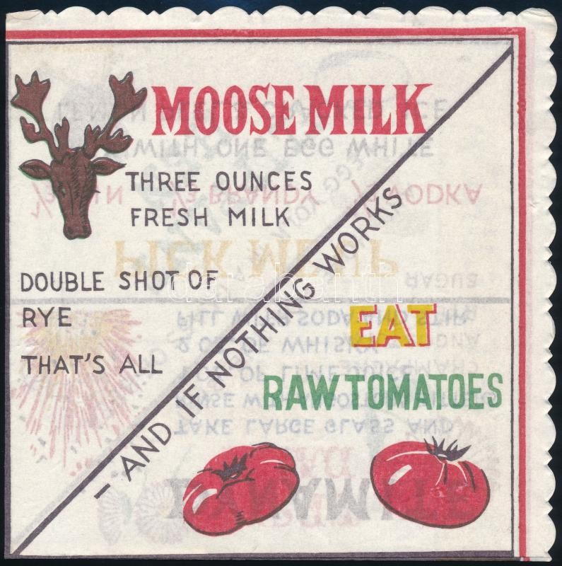 cca 1950-1960 "Moose Milk" feliratú szalvéta, 17×17 cm https://www.darabanth.com/de/374-Fernauktion/374.0/Kunst-Dokumente-andere-Sammelgebiete/Werbungen~22/cca-1950-1960-Moose-Milk-feliratu-szalveta-17C39717-cm~II2190165