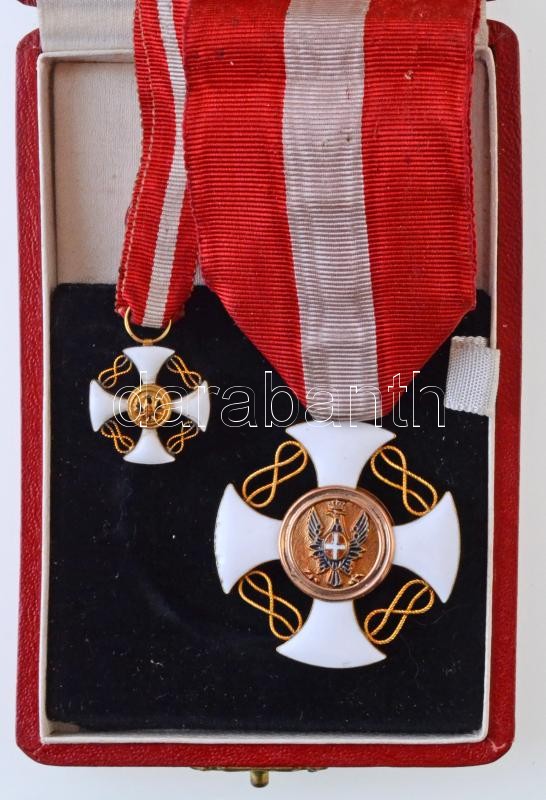 Olaszország 1868. "Olasz Koronarend Tisztikeresztje" Au zománcozott kitüntetés mellszalaggal, miniatűrrel, eredeti tokban (35,5mm) T:2 használatból eredő zománchiba / Italy 1868. "Italian Order of the Crown, Officer's Cross" Au enamelled decoration with ribbon, miniature, in original "D. CRAVANZOLA" case (35,5mm) C:XF minor enamel damage caused by usage