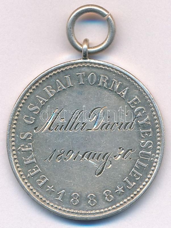 1888. "Békéscsabai Torna Egyesület / Egészséges testben egészséges lélek" ausztriai import fémjellel jelzett Ag sport díjérem, gravírozva "Müller Dávid 1891 aug 30" (8,60g/28,5mm) T:1-