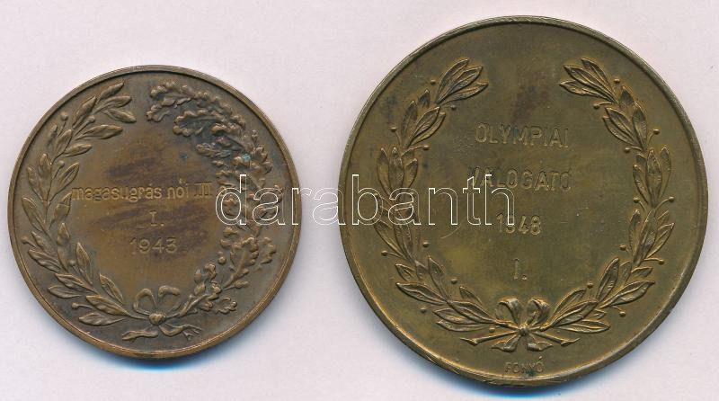 Beschreibung: 1943. "Weiss Manfred Vállalatok Testedző Köre" kétoldalas Br sport díjérem, hátoldalon gravírozva "Magasugrás női III. o. I. 1943" (40mm) + 1948. "Weiss Manfred Vállalatok Testedző Köre" kétoldalas Br sport díjérem, hátoldalon gravírozva "Olympiai Válogató 1948. I.", hátoldalon "FONYÓ" gyártói jelzéssel (51mm) T:2 kis patina