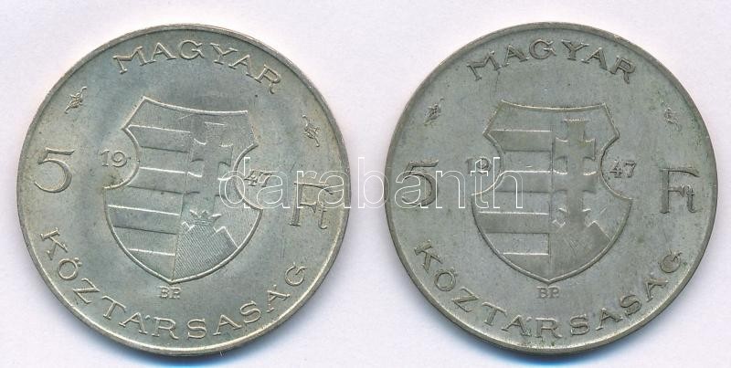 1947. 5Ft Ag "Kossuth" (2x) T:2,2- kis patina Adamo F8.1 https://www.darabanth.com/de/374-Fernauktion/374.0/Numismatik/Ungarische-Munzen-und-Munzen-mit-ungarischem-Munzzeichen~1500008/1947-5Ft-Ag-Kossuth-2x-T2-2-kis-patina-Adamo-F81~II2170029