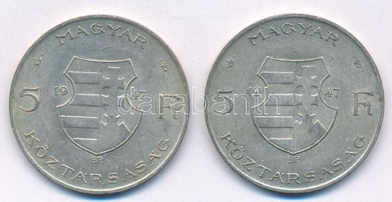 1947. 5Ft Ag "Kossuth" (2x) T:2- Adamo F8.1 https://www.darabanth.com/de/374-Fernauktion/374.0/Numismatik/Ungarische-Munzen-und-Munzen-mit-ungarischem-Munzzeichen~1500008/1947-5Ft-Ag-Kossuth-2x-T2-Adamo-F81~II2170024