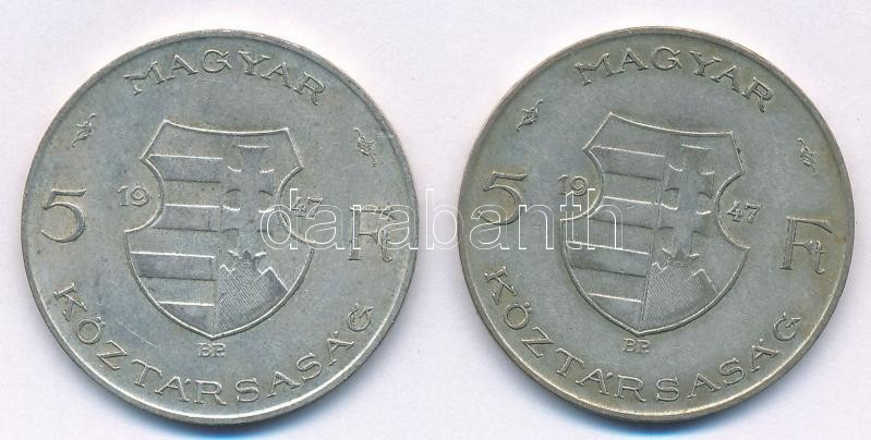 1947. 5Ft Ag "Kossuth" (2x) T:2 Adamo F8.1 https://www.darabanth.com/de/374-Fernauktion/374.0/Numismatik/Ungarische-Munzen-und-Munzen-mit-ungarischem-Munzzeichen~1500008/1947-5Ft-Ag-Kossuth-2x-T2-Adamo-F81~II2170306