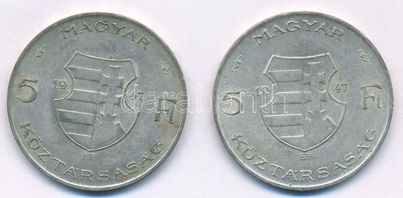 1947. 5Ft Ag "Kossuth" (2x) T:3 Adamo F8.1 https://www.darabanth.com/de/374-Fernauktion/374.0/Numismatik/Ungarische-Munzen-und-Munzen-mit-ungarischem-Munzzeichen~1500008/1947-5Ft-Ag-Kossuth-2x-T3-Adamo-F81~II2170296