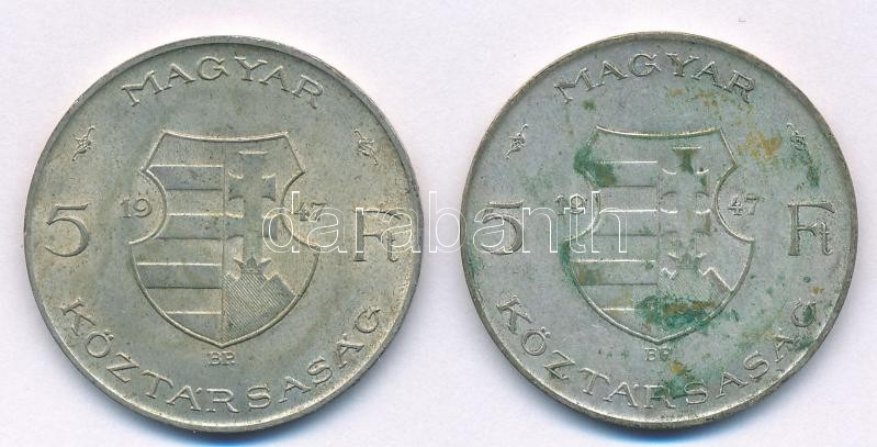 1947. 5Ft Ag "Kossuth" (2x) T:3 patina Adamo F8.1 https://www.darabanth.com/de/374-Fernauktion/374.0/Numismatik/Ungarische-Munzen-und-Munzen-mit-ungarischem-Munzzeichen~1500008/1947-5Ft-Ag-Kossuth-2x-T3-patina-Adamo-F81~II2170295