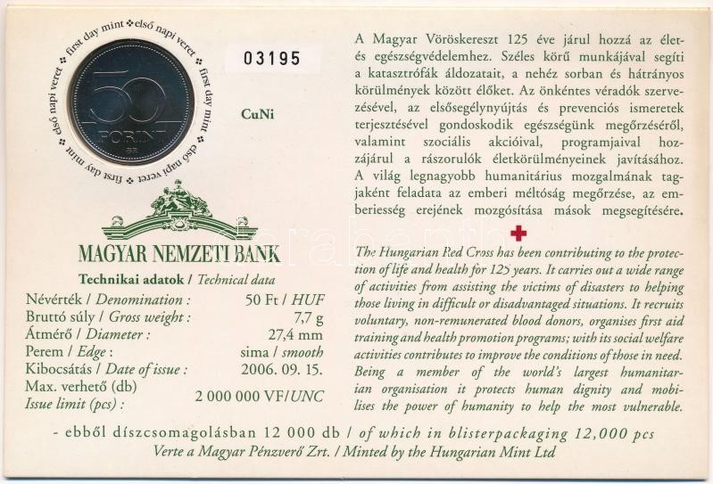 2006. 50Ft "125 éves a Magyar Vöröskereszt" első napi veret ... https://www.darabanth.com/de/374-Fernauktion/374.0/Numismatik/Ungarische-Munzen-und-Munzen-mit-ungarischem-Munzzeichen~1500008/2006-50Ft-125-eves-a-Magyar-Voroskereszt-elso-napi-veret-szamozott-emleklapon-T1~II2186528