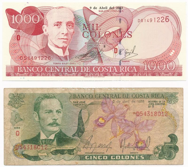 Costa Rica 1988. 5 Colones + 2003. 1000 Colones C:UNC