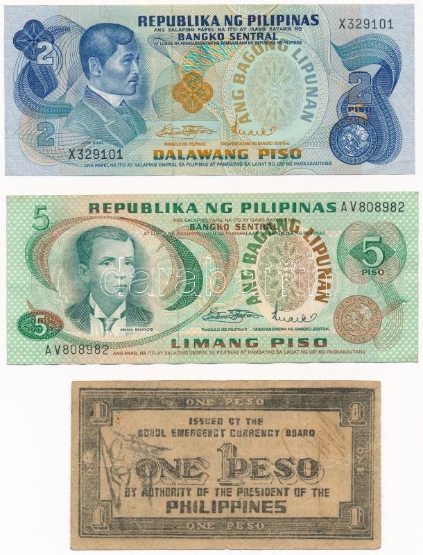 Philippines 1943. 1 Peso + 1974-1985. 2 Pesos + 5 Pesos C:F,XF