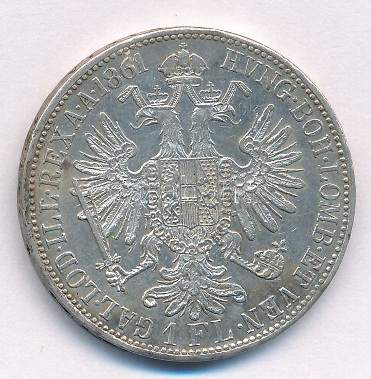 Ausztria 1861A 1Fl Ag "Ferenc József" T:1-,2 kis ph., patina... https://www.darabanth.com/de/374-Fernauktion/374.0/Numismatik/Weltweit-Munzen~1500021/Ausztria-1861A-1Fl-Ag-Ferenc-Jozsef-T1-2-kis-ph-patina-Austria-1861A-1-Florin-Ag-Franz-Jose~II2186388