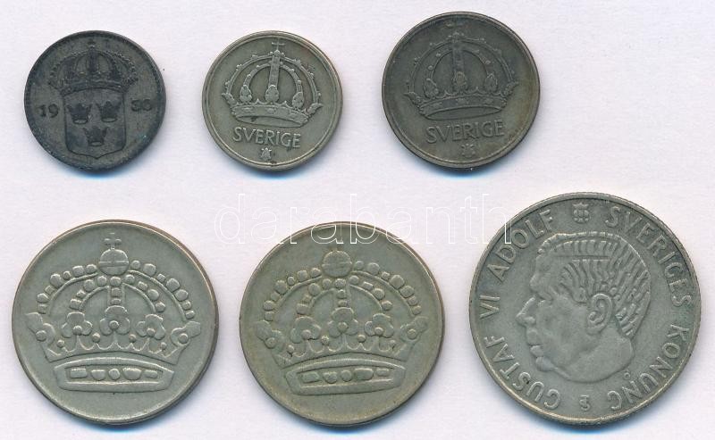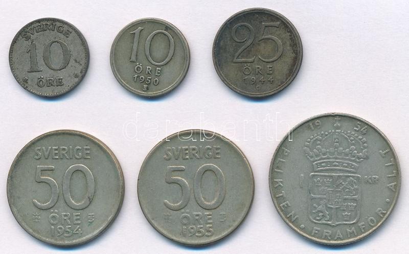 Svédország 1930-1950. 10ö Ag (2xklf) + 1944. 25ö Ag + 1954-1955. 50ö Ag (2xklf) + 1954. 1K Ag T:2,2- patina