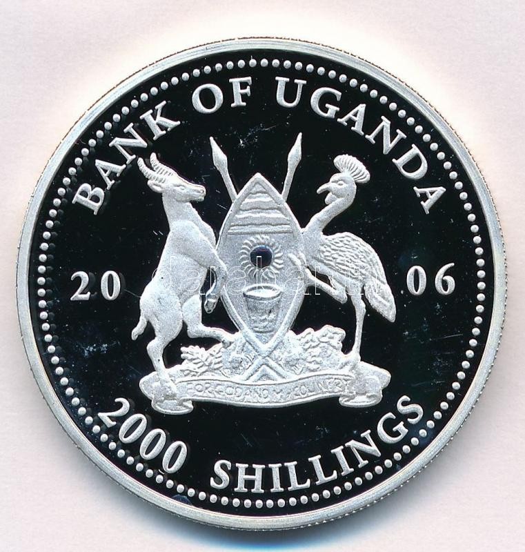 Uganda 2006. 2000Sh "A labdarúgás halhatatlanjainak csarnoka - Magyarország 1950-es évek / Puskás Ferenc", bizonytalan Ag tartalommal (26,74g) T: PP kis karc, fo. Uganda 2006. 2000 Shillings "The Hall of Fame of Football - Hungary 1950's / Puskás Ferenc", with uncertain Ag content (26,74g) C:PP slightly scratched, spotted