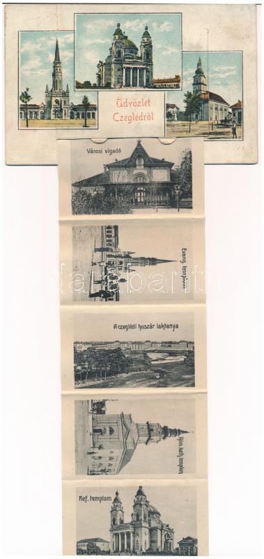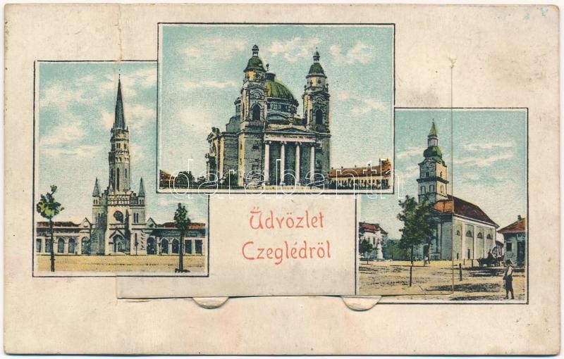 1911 Cegléd, Református, Evangélikus és Római katolikus templom. leporellólap, belül: vasútállomás, városi vigadó, könyvnyomda, stb. Nagy Elek kiadása (b)